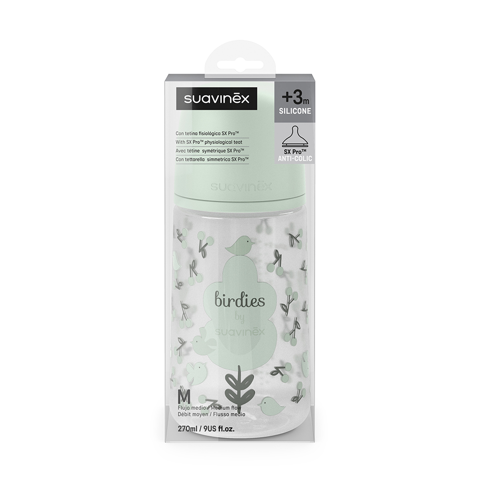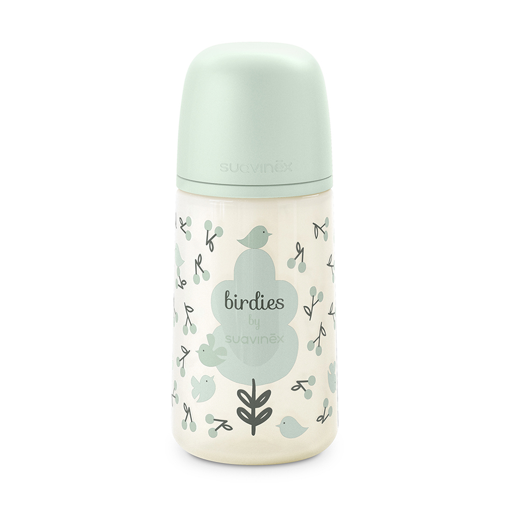 Зелёная бутылочка Suavinex Birdies наполняет момент кормления ощущением свежести и спокойствия. Её мягкий оттенок напоминает утреннюю зелень и гармонию природы, а лёгкая форма делает каждое прикосновение естественным и тёплым.