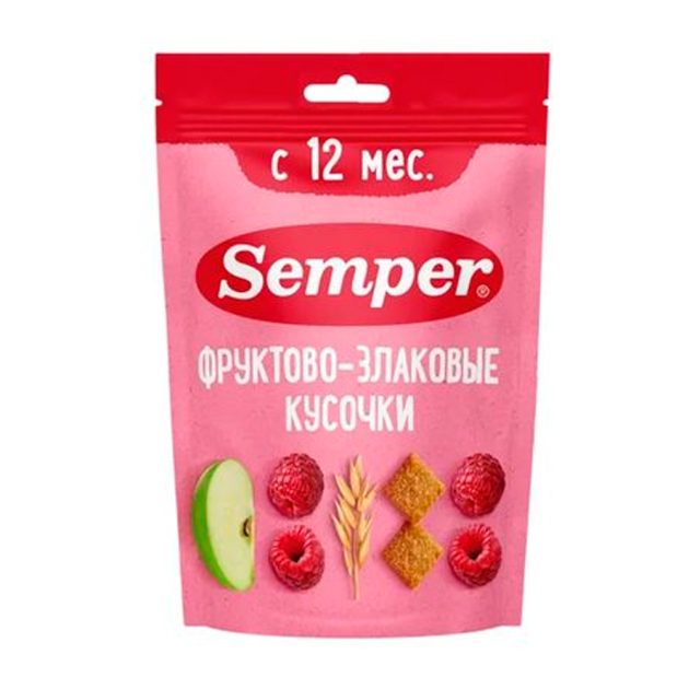 Semper — это больше, чем детское питание – это по-настоящему вкусная еда, которая помогает вашему малышу расти здоровым и с удовольствием знакомиться с миром. Продукт представляет собой индивидуально упакованные кусочки – можно съесть все сразу, а можно и разделить на несколько раз. Каждый кусочек содержит около 30% цельных злаков, которые обогащают рацион малыша ценными пищевыми волокнами и помогают ему оставаться сытым на протяжении долгого времени.