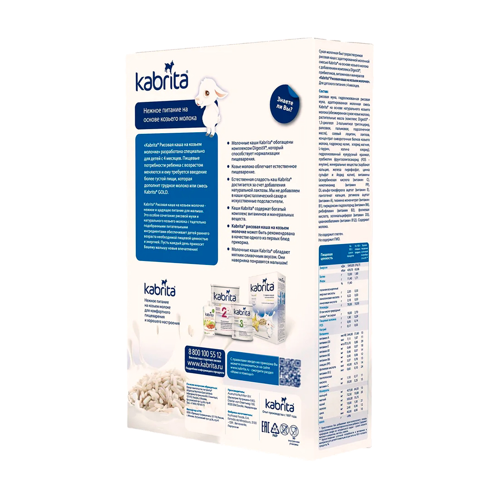 Нежная и воздушная рисовая каша на основе адаптированной смеси Kabrita идеальна для бережного перехода к злаковому прикорму и сбалансированного питания малыша первого года жизни. Приятный сливочный вкус каш Kabrita достигается исключительно за счет натурального молочного сахара – лактозы, без добавления подсластителей.
