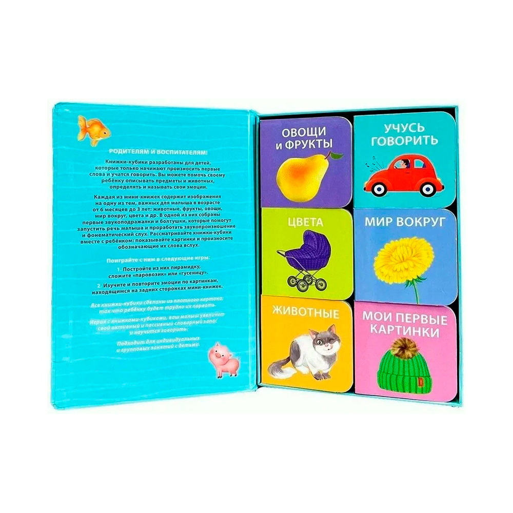 «Первая книга малыша» ? набор книжек-кубиков для детей в возрасте от 6 месяцев. Внутри вы найдёте 6 мини-книжек с картинками и подписями к ним на самые важные первые темы, которые помогут малышу познакомиться с окружающим миром и запомнить новые слова, а также со звукоподражалками и болтушками. С помощью этих книжек-кубиков ваш малыш быстрее научится говорить, познакомится с новыми словами и понятиями, пополнит активный и пассивный словарь. Рассматривайте мини-книжки вместе с ребёнком, показывайте ему картинки и произносите обозначающие их слова вслух. Стройте из книжек-кубиков пирамидки, изучайте первые эмоции по картинкам, находящимся на их обратных сторонках.