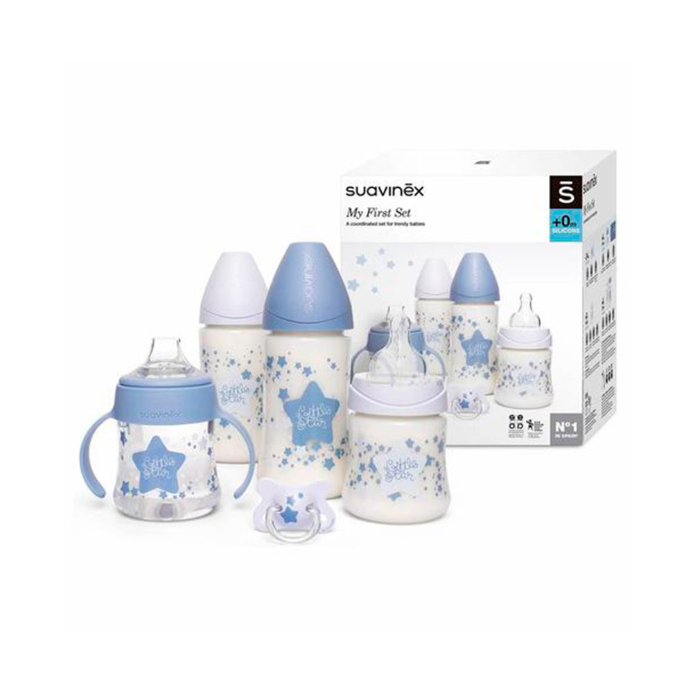 Первый набор от бренда Suavinex, коллеккция Little Star. В комплекте бутылочка и поильник 150 мл, две бутылочки 270 мл, а также пустышка Basic от 2 до 4 мес.