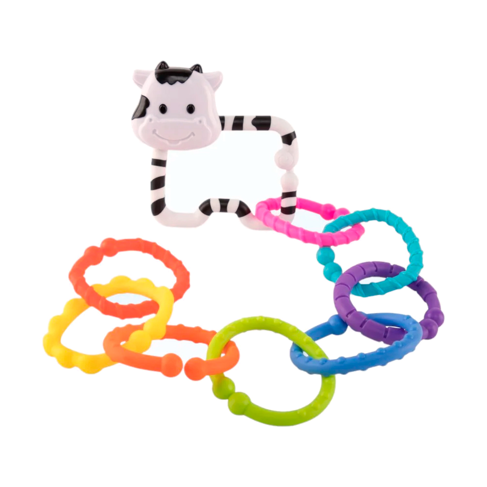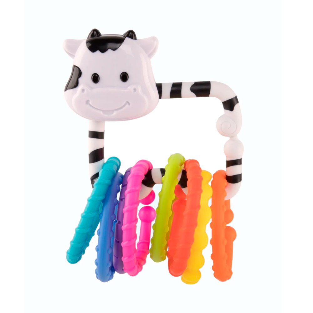 Погремушка MOO-RING — отличный выбор для развлечения любознательного малыша. Ее форма очень удобна для держания, а небольшой размер способствует длительной игре и концентрации внимания ребенка. Яркие кольца помогают в развитии цветового и зрительного восприятия, а также их рельефная разнообразная поверхность способствует развитию мелкой моторики и тактильных ощущений.
