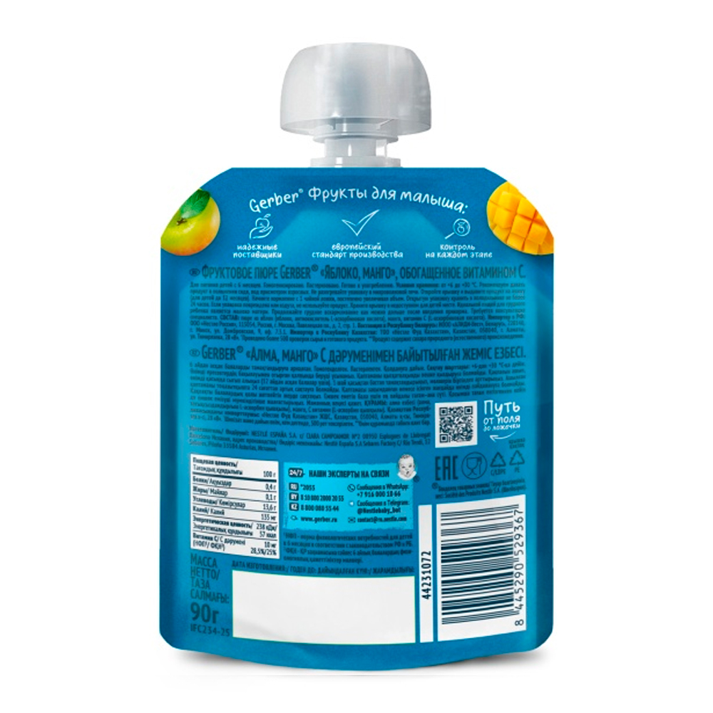 Более 95 лет экспертизы в производтве продуктов детского прикорма. Изготовлено без использования генетически модифицированных ингредиентов, искусственных консервантов, красителей, ароматизаторов и сахара. Только лучшие фрукты собранные вручную попадают в детское питание Gerber. Продукция Gerber проходит более 500 проверок на разных этапах производства, чтобы предложить лучшее вашему малышу.