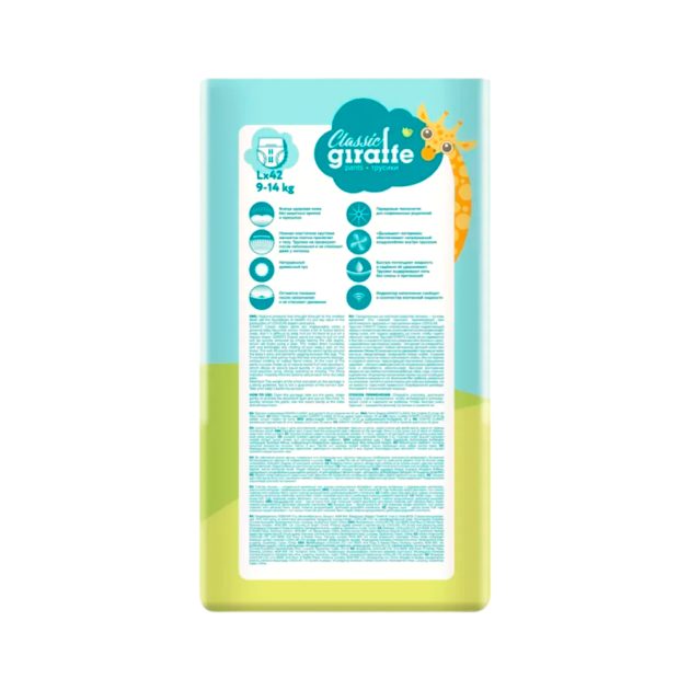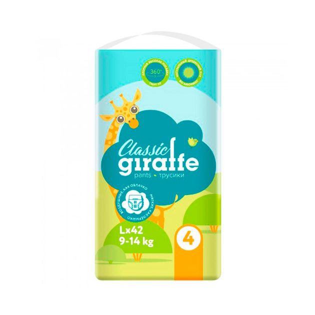 Трусики — подгузники Giraffe необходимы, когда ребенок активный или капризничает перед сном и его трудно удержать на спине, чтобы надеть обычный подгузник. Трусики легко надеваются и снимаются. Мягкая 3D резинка плотно держит трусики на талии малыша, без провисания между ножек, создавая комфорт во время движения. Трехрядная барьерная стрейч -полоска мягко окружает ножки, без натираний и следов от резинок, предотвращая протекание. Равномерное распределение абсорбента внутри рабочего слоя трусиков обеспечивает быстрое впитывание и поглощение жидкости при любом положении ребенка — лежа, сидя, стоя, в движении или во время сна, сохраняя детскую кожу сухой и здоровой. Гипоаллергенность обеспечивается благодаря использованию только качественные материалы, не вызывающие аллергию. Кроме того полностью отсутствует запах. Состав: распушенная целлюлоза, нетканые материалы, влагопоглощающий материал.